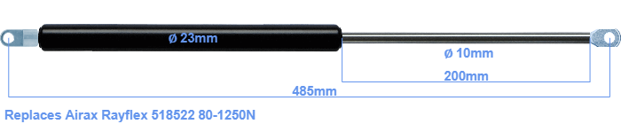 Replacement gas spring for the Airax Rayflex 518522 80-1250 Newton. Mounting part tube: The eye has a thickness of 5mm and a hole diameter of 8.1mm. Mounting part rod : The eye has a thickness of 10mm and a hole diameter of 8.1mm. Brand: HAHN, a Stabilus company.