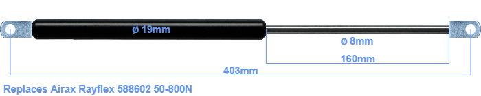 Replacement gas spring for the Airax Rayflex 588602 50-800 Newton. The eye has a thickness of 10mm and a hole diameter of 8.1mm. Brand: HAHN, a Stabilus company.