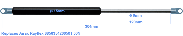 Replacement gas spring for the Airax Rayflex 6856354200501 50 Newton. The eye has a thickness of 3mm and a hole diameter of 6.1mm. Brand: HAHN, a Stabilus company.