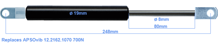 Replacement gas spring for the APSOvib 12.2162.1070 700 Newton. Mounting part tube: The eye has a thickness of 5mm and a hole diameter of 8.1mm. Mounting part rod : The eye has a thickness of 10mm and a hole diameter of 8.1mm. Brand: HAHN, a Stabilus company.