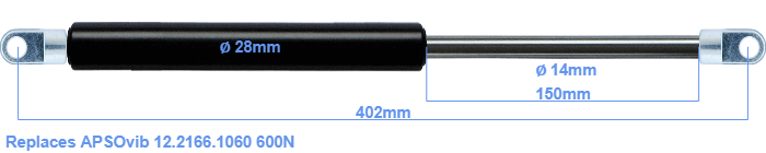 The diameter of the cylinder of this gas spring is 28 mm. The diameter of the rod totals 14 mm. The rod (the chrome part) is 150 mm long. The total length of this replacement gas spring is 402 mm. This is the total distance between the centers of the two mounting parts. The length from thread to thread (exlcuding the mounting parts) is 348 millimeter. The force of this replacement gas spring is 600 Newton. This is not an official APSOvib gas spring, but a so called replacement. This a gas spring with the brand HAHN. The force (600 N) and dimensions are close to identical to the original.