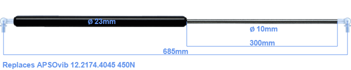 The diameter of the cylinder of this gas spring is 23 millimeters. The cross section of the rod is 10 mm. The stroke of the gas spring is 300 millimeter. The total length of this replacement gas spring is 685 mm. Keep in mind that this is the length between the centers of the mounting parts. The length from thread to thread (wihout mounting parts) is 645 mm. This replacement gas spring has a force of 450 Newton. This is not an original gas spring produced by APSOvib, but it can replace a APSOvib gas spring. This gas spring was produced by Stabilus subsidiary HAHN. The gas spring can be used without problems as a replacement, because the dimensions and force nearly equal.