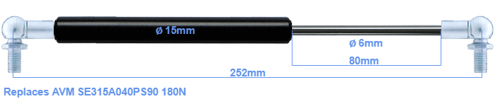 The bore of the house of this replacement gas spring is 15 mm. The diameter of the rod totals 6 mm. The chrome part is called the rod. It has a length of 80 mm. The total length of this gas strut is 252 mm. This is the total distance between the centers of the two mounting parts. Without the mounting parts this gas spring is 208 mm long (thread to thread). This gas spring (SE315A040PS90) has a force of 180 Newton. This gas spring can replace a AVM gas spring, but is not an orignal AVM one. This a gas spring with the brand HAHN. Nevertheless, the force and dimensions equal.