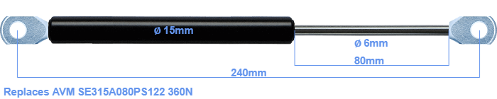The bore of the house of this replacement gas spring is 15 mm. The rod has a diameter of 6 mm. The stroke (the retracting part) has a length of 80 mm. The total length of this replacement is exactly 240 mm. Keep in mind that this is the length between the centers of the mounting parts. Without the mounting parts this gas spring is 208 mm long (thread to thread). This replacement gas spring has a force of 360 Newton. This is not an original gas spring from AVM, but a so called replacement gas spring. This gas spring was produced by Stabilus subsidiary HAHN. Nevertheless, the dimensions and force are nearly equal.