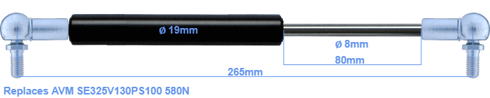 Replacement gas spring for the AVM SE325V130PS100 580 Newton. This fits a (possibly already present) ball with a diameter of 13mm. A corresponding ball is included. Brand: HAHN, a Stabilus company.