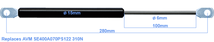 Replacement gas spring for the AVM SE400A070PS122 310 Newton. The eye has a thickness of 10mm and a hole diameter of 8.1mm. Brand: HAHN, a Stabilus company.