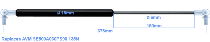 The diameter of the cylinder of this gas spring is 15 mm. The diameter of the rod is 6 millimeter. The stroke (the retracting part) has a length of 150 mm. The total length of this replacement is exactly 376 mm. This is the distance between the centers of the mounting parts. Without the mounting parts this gas spring is 332 mm long (thread to thread). This replacement gas spring has a force of 135 Newton. This is not an official AVM gas spring, but a so called replacement. This gas spring was produced by Stabilus subsidiary HAHN. Nevertheless, the force and dimensions equal.