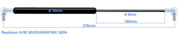 This gas spring has a cylinder diameter of 15 mm. The rod has a diameter of 6 mm. The stroke of the gas spring is 150 millimeter. The total length of this gas strut is 376 mm. This is the distance between the centers of the mounting parts. Without the mounting parts this gas spring is 332 mm long (thread to thread). The force of this replacement is 360 Newton. This is not an original gas spring from AVM, but a so called replacement gas spring. This gas spring was produced by Stabilus subsidiary HAHN. Nevertheless, the force and dimensions equal.