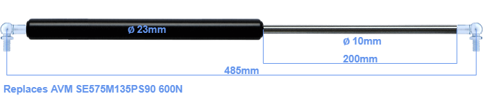 Replacement gas spring for the AVM SE575M135PS90 600 Newton. This fits a (possibly already present) ball with a diameter of 10mm. A corresponding ball is included. Brand: HAHN, a Stabilus company.