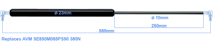 The diameter of the black cylinder of this gas spring is 23 millimeter. The cross section of the rod is 10 mm. The stroke of the gas spring is 250 millimeter. The total length of this gas strut is 585 mm. This is the distance between the centers of the mounting parts. Without the mounting parts this gas spring is 545 mm long (thread to thread). This gas spring (SE850M085PS90) has a force of 380 Newton. This is not an official AVM gas spring, but a so called replacement. This gas spring was produced by Stabilus subsidiary HAHN. Nevertheless, the dimensions and force are nearly equal.