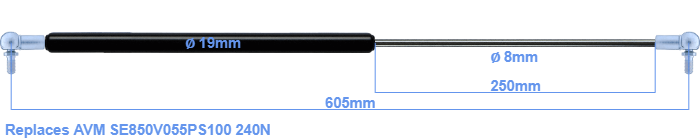 The diameter of the cylinder of this gas spring is 19 mm. The diameter of the rod is 8 millimeter. The stroke is 250 millimeter long. The total length of this gas strut is 545 mm. This is the total distance between the centers of the two mounting parts. Without the mounting parts this gas spring is 545 mm long (thread to thread). This replacement gas spring (SE850V055PS100) has a force of 240 Newton (N). This is not an official AVM gas spring, but a so called replacement. HAHN Gasfedern, a Stabilus subsidiary, is responsible for the production of this replacement gas spring. The gas spring has the brand HAHN. The force (240 N) and dimensions are almost identical to the original.