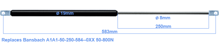 This gas spring has a cylinder diameter of 19 mm. The rod has a diameter of 8 mm. The stroke of the gas spring is 250 millimeter. The total length of this replacement gas spring is 583 mm. Attention: this is the length between the centers of the mounting parts. Without the mounting parts this gas spring is 545 mm long (thread to thread). This gas spring (A1A1-50-250-584--0XX) has a force of 50-800 Newton. This gas spring can replace a Bansbach gas spring, but is not an orignal Bansbach one. This a gas spring with the brand HAHN. Nevertheless, the force and dimensions equal.
