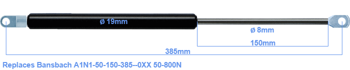Replacement gas spring for the Bansbach A1N1-50-150-385--0XX 50-800 Newton. Mounting part tube: The eye has a thickness of 5mm and a hole diameter of 8.1mm. Mounting part rod : The eye has a thickness of 10mm and a hole diameter of 8.1mm. Brand: HAHN, a Stabilus company.