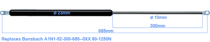 Replacement gas spring for the Bansbach A1N1-52-300-685--0XX 80-1250 Newton. Mounting part tube: The eye has a thickness of 5mm and a hole diameter of 8.1mm. Mounting part rod : The eye has a thickness of 10mm and a hole diameter of 8.1mm. Brand: HAHN, a Stabilus company.