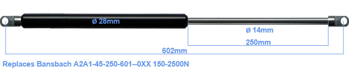 The diameter of the black cylinder of this gas spring is 28 millimeter. The diameter of the rod totals 14 mm. The stroke is 250 millimeter long. The total length of this replacement is 602 millimeter. Note: this is the total length between the rotation points of the two mounting parts. The distance from thread to thread (without mounting parts) is 548 mm. This replacement gas spring (A2A1-45-250-601--0XX) has a force of 150-2500 Newton (N). This gas spring can replace a Bansbach gas spring, but is not an orignal Bansbach one. HAHN Gasfedern, a Stabilus subsidiary, is responsible for the production of this replacement gas spring. The gas spring has the brand HAHN. The gas spring can be used without problems as a replacement, because the dimensions and force close to equal.