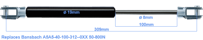 The bore of the house of this replacement gas spring is 19 mm. The cross section of the rod is 8 mm. The stroke of the gas spring is 100 millimeter. The total length of this replacement gas spring is 309 mm. This is the distance between the centers of the mounting parts. Without the mounting parts this gas spring is 245 mm long (thread to thread). This gas spring (A5A5-40-100-312--0XX) has a force of 50-800 Newton. This is not an original gas spring from Bansbach, but a so called replacement gas spring. This gas spring was produced by Stabilus subsidiary HAHN. The gas spring can be used without problems as a replacement, because the dimensions and force equal.