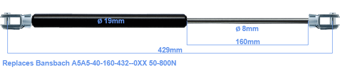 Replacement gas spring for the Bansbach A5A5-40-160-432--0XX 50-800 Newton. The fork has a hole diameter of 8.1mm. Brand: HAHN, a Stabilus company.