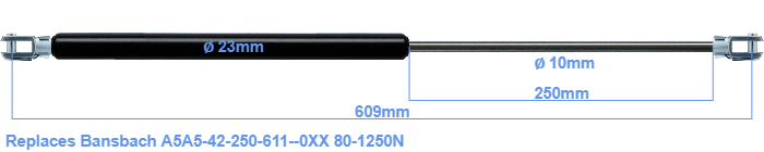 This gas spring has a cylinder diameter of 23 mm. The cross section of the rod is 10 mm. The rod (the chrome part) is 250 mm long. The total length of this replacement is 609 millimeter. This is the total distance between the centers of the two mounting parts. The length from thread to thread (wihout mounting parts) is 545 mm. The force of this replacement is 80-1250 Newton. This is not an original gas spring produced by Bansbach, but it can replace a Bansbach gas spring. This replacement gas spring is a HAHN gas spring. Nevertheless, the dimensions and force are almost entirely equal.