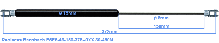 This gas spring has a cylinder diameter of 15 mm. The cross section of the rod is 6 mm. The stroke (the retracting part) has a length of 150 mm. The total length of this gas strut is 372 mm. Attention: this is the length between the centers of the mounting parts. Without the mounting parts this gas spring is 332 mm long (thread to thread). The force of this replacement is 30-450 Newton. This is not an original gas spring from Bansbach, but a so called replacement gas spring. This gas spring was produced by Stabilus subsidiary HAHN. Nevertheless, this gas spring can be used as replacement gas spring, because the dimensions and forces are nearly equal.