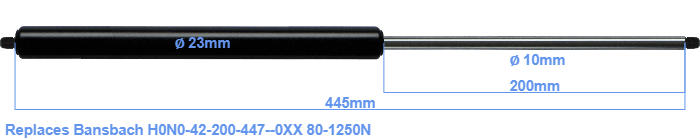 The diameter of the cylinder of this gas spring is 23 mm. The diameter of the rod is 10 millimeter. The stroke (the retracting part) has a length of 200 mm. The total length of this gas strut is 445 mm. Attention: this is the length between the centers of the mounting parts. Without the mounting parts this gas spring is 445 mm long (thread to thread). This gas spring (H0N0-42-200-447--0XX) has a force of 80-1250 Newton. This gas spring can replace a Bansbach gas spring, but is not an orignal Bansbach one. This replacement gas spring is a HAHN gas spring. Nevertheless, the dimensions and force are almost equal.