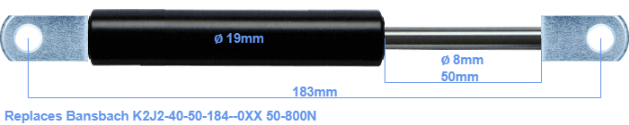 Replacement gas spring for the Bansbach K2J2-40-50-184--0XX 50-800 Newton. The eye has a thickness of 10mm and a hole diameter of 8.1mm. Brand: HAHN, a Stabilus company.