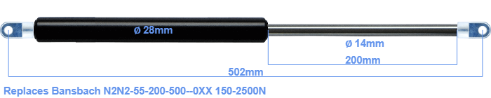 This gas spring has a cylinder diameter of 28 mm. The diameter of the rod is 14 millimeter. The rod (the chrome part) is 200 mm long. The total length of this replacement is 502 millimeter. This is the distance between the centers of the mounting parts. Without the mounting parts this gas spring is 448 mm long (thread to thread). This replacement gas spring (N2N2-55-200-500--0XX) has a force of 150-2500 Newton (N). This is not an official Bansbach gas spring, but a so called replacement. HAHN Gasfedern, a Stabilus subsidiary, is responsible for the production of this replacement gas spring. The gas spring has the brand HAHN. The gas spring can be used without problems as a replacement, because the dimensions and force nearly equal.