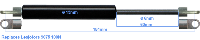 The diameter of the cylinder of this gas spring is 15 millimeters. The cross section of the rod is 6 mm. The stroke (the retracting part) has a length of 60 mm. The total length of this replacement gas spring is 184 mm. Keep in mind that this is the length between the centers of the mounting parts. The length from thread to thread (exlcuding the mounting parts) is 152 millimeter. This replacement gas spring (9075) has a force of 100 Newton (N). This is not an official Lesjöfors gas spring, but a so called replacement. This replacement gas spring is a HAHN gas spring. The gas spring can be used without problems as a replacement, because the dimensions and force close to equal.