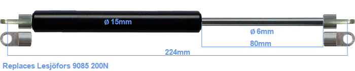 The diameter of the black cylinder of this gas spring is 15 millimeter. The cross section of the rod is 6 mm. The stroke of the gas spring is 80 millimeter. The total length of this replacement is 224 millimeter. This is the distance between the centers of the mounting parts. The length from thread to thread (wihout mounting parts) is 192 mm. The force of this replacement gas spring is 200 Newton. This is not an original gas spring from Lesjöfors, but a so called replacement gas spring. This replacement gas spring is a HAHN gas spring. Nevertheless, the force and dimensions almost equal.