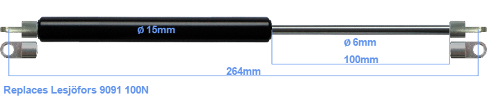 The diameter of the cylinder of this gas spring is 15 mm. The diameter of the rod is 6 millimeter. The stroke (the retracting part) has a length of 100 mm. In total, the length is 264 millimeter. Attention: this is the length between the centers of the mounting parts. The distance from thread to thread (without mounting parts) is 232 mm. This replacement gas spring has a force of 100 Newton. Attention: this is not an official Lesjöfors gas spring, but a replacement gas spring. HAHN Gasfedern, a Stabilus subsidiary, is responsible for the production of this replacement gas spring. The gas spring has the brand HAHN. The force (100 N) and dimensions are almost identical to the original.
