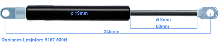 The bore of the house of this replacement gas spring is 19 mm. The rod has a diameter of 8 mm. The chrome part is called the rod. It has a length of 80 mm. The total length of this gas strut is 245 mm. Attention: this is the length between the centers of the mounting parts. Without the mounting parts this gas spring is 205 mm long (thread to thread). This gas spring (9157) has a force of 500 Newton. This gas spring can replace a Lesjöfors gas spring, but is not an orignal Lesjöfors one. This a gas spring with the brand HAHN. Nevertheless, this gas spring can be used as replacement gas spring, because the dimensions and forces are nearly equal.