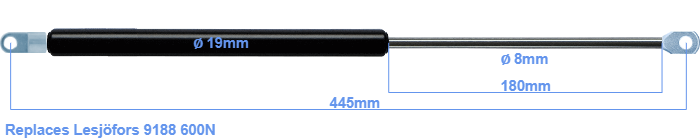 This gas spring has a cylinder diameter of 19 mm. The rod has a diameter of 8 mm. The stroke of the gas spring is 180 millimeter. The total length of this replacement gas spring is 445 mm. Keep in mind that this is the length between the centers of the mounting parts. The length from thread to thread (wihout mounting parts) is 405 mm. This gas spring (9188) has a force of 600 Newton. This is not an official Lesjöfors gas spring, but a so called replacement. This is a HAHN gas spring. Nevertheless, this gas spring can be used as replacement gas spring, because the dimensions and forces are almost equal.