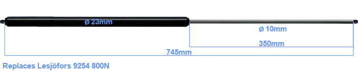 The bore of the house of this replacement gas spring is 23 mm. The cross section of the rod is 10 mm. The rod (the chrome part) is 350 mm long. The total length of this gas strut is 745 mm. This is the distance between the centers of the mounting parts. The length from thread to thread (wihout mounting parts) is 745 mm. This replacement gas spring (9254) has a force of 800 Newton (N). Attention: this is not an official Lesjöfors gas spring, but a replacement gas spring. This replacement gas spring is a HAHN gas spring. Nevertheless, this gas spring can be used as replacement gas spring, because the dimensions and forces are close to equal.