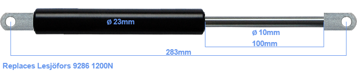 The bore of the house of this replacement gas spring is 23 mm. The diameter of the rod totals 10 mm. The stroke of the gas spring is 100 millimeter. The total length of this replacement is 283 millimeter. Attention: this is the length between the centers of the mounting parts. The distance from thread to thread (without mounting parts) is 245 mm. This replacement gas spring has a force of 1200 Newton. This gas spring can replace a Lesjöfors gas spring, but is not an orignal Lesjöfors one. This gas spring was produced by Stabilus subsidiary HAHN. The force (1200 N) and dimensions are almost identical to the original.
