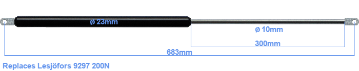 The diameter of the cylinder of this gas spring is 23 mm. The diameter of the rod is 10 millimeter. The stroke (the retracting part) has a length of 300 mm. The total length of this replacement gas spring is 683 mm. Note: this is the total length between the rotation points of the two mounting parts. The length from thread to thread (wihout mounting parts) is 645 mm. The force of this replacement is 200 Newton. This is not an original gas spring produced by Lesjöfors, but it can replace a Lesjöfors gas spring. This replacement gas spring is a HAHN gas spring. Nevertheless, the dimensions and force are close to equal.