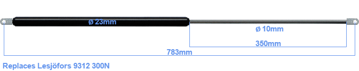 The diameter of the cylinder of this gas spring is 23 mm. The diameter of the rod totals 10 mm. The chrome part is called the rod. It has a length of 350 mm. The total length of this replacement gas spring is 783 mm. This is the distance between the centers of the mounting parts. Without the mounting parts this gas spring is 745 mm long (thread to thread). The force of this replacement is 300 Newton. This is not an official Lesjöfors gas spring, but a so called replacement. HAHN Gasfedern, a Stabilus subsidiary, is responsible for the production of this replacement gas spring. The gas spring has the brand HAHN. The force (300 N) and dimensions are almost identical to the original.