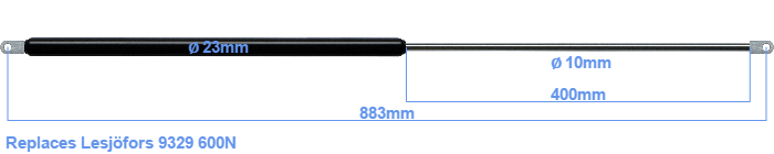 The diameter of the cylinder of this gas spring is 23 millimeters. The diameter of the rod is 10 millimeter. The stroke of the gas spring is 400 millimeter. The total length of this gas strut is 883 mm. This is the total distance between the centers of the two mounting parts. The length from thread to thread (wihout mounting parts) is 845 mm. This replacement gas spring (9329) has a force of 600 Newton (N). This is not an original gas spring produced by Lesjöfors, but it can replace a Lesjöfors gas spring. This gas spring was produced by Stabilus subsidiary HAHN. The gas spring can be used without problems as a replacement, because the dimensions and force almost equal.