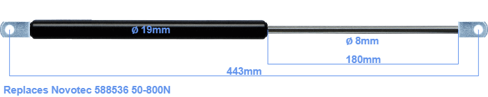 The diameter of the black cylinder of this gas spring is 19 millimeter. The diameter of the rod is 8 millimeter. The stroke of the gas spring is 180 millimeter. The total length of this replacement gas spring is 443 mm. Attention: this is the length between the centers of the mounting parts. Without the mounting parts this gas spring is 405 mm long (thread to thread). This replacement gas spring (588536) has a force of 50-800 Newton (N). This is not an official Novotec gas spring, but a so called replacement. This replacement gas spring is a HAHN gas spring. Nevertheless, the dimensions and force are close to equal.