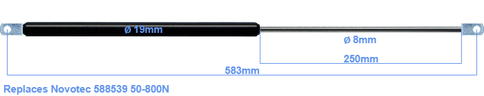 Replacement gas spring for the Novotec 588539 50-800 Newton. The eye has a thickness of 10mm and a hole diameter of 8.1mm. Brand: HAHN, a Stabilus company.