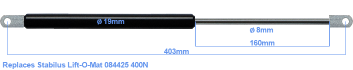 The diameter of the black cylinder of this gas spring is 19 millimeter. The rod has a diameter of 8 mm. The stroke is 160 millimeter long. The total length of this replacement is 403 millimeter. Note: this is the total length between the rotation points of the two mounting parts. Without the mounting parts this gas spring is 365 mm long (thread to thread). This replacement gas spring (084425) has a force of 400 Newton (N). This gas spring can replace a Stabilus Lift-O-Mat gas spring, but is not an orignal Stabilus Lift-O-Mat one. This replacement gas spring is a HAHN gas spring. Nevertheless, this gas spring can be used as replacement gas spring, because the dimensions and forces are almost entirely equal.