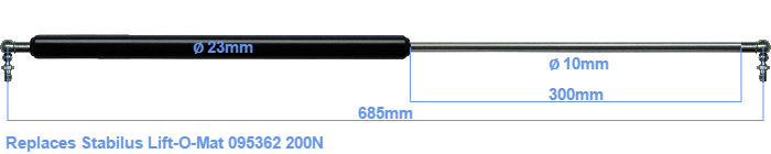 The diameter of the cylinder of this gas spring is 23 millimeters. The diameter of the rod totals 10 mm. The rod (the chrome part) is 300 mm long. The total length of this replacement is 685 millimeter. Note: this is the total length between the rotation points of the two mounting parts. Without the mounting parts this gas spring is 645 mm long (thread to thread). This replacement gas spring (095362) has a force of 200 Newton (N). This is not an original gas spring produced by Stabilus Lift-O-Mat, but it can replace a Stabilus Lift-O-Mat gas spring. This gas spring was produced by Stabilus subsidiary HAHN. Nevertheless, the force and dimensions almost equal.