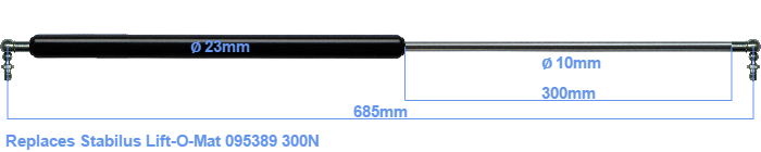 The diameter of the cylinder of this gas spring is 23 mm. The cross section of the rod is 10 mm. The chrome part is called the rod. It has a length of 300 mm. The total length of this replacement is exactly 685 mm. This is the total distance between the centers of the two mounting parts. The distance from thread to thread (without mounting parts) is 645 mm. The force of this replacement gas spring is 300 Newton. This is not an original gas spring produced by Stabilus Lift-O-Mat, but it can replace a Stabilus Lift-O-Mat gas spring. This a gas spring with the brand HAHN. Nevertheless, the force and dimensions almost equal.