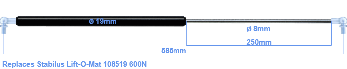 The diameter of the black cylinder of this gas spring is 19 millimeter. The diameter of the rod is 8 millimeter. The stroke is 250 millimeter long. The total length of this replacement gas spring is 585 mm. Note: this is the total length between the rotation points of the two mounting parts. The length from thread to thread (wihout mounting parts) is 545 mm. This gas spring (108519) has a force of 600 Newton. This gas spring can replace a Stabilus Lift-O-Mat gas spring, but is not an orignal Stabilus Lift-O-Mat one. This gas spring was produced by Stabilus subsidiary HAHN. Nevertheless, the force and dimensions equal.