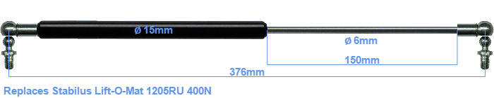 The diameter of the black cylinder of this gas spring is 15 millimeter. The diameter of the rod totals 6 mm. The stroke is 150 millimeter long. The total length of this replacement is exactly 376 mm. Attention: this is the length between the centers of the mounting parts. Without the mounting parts this gas spring is 332 mm long (thread to thread). This replacement gas spring (1205RU) has a force of 400 Newton (N). This is not an official Stabilus Lift-O-Mat gas spring, but a so called replacement. This a gas spring with the brand HAHN. Nevertheless, the dimensions and force are equal.