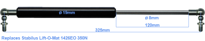The bore of the house of this replacement gas spring is 19 mm. The diameter of the rod is 8 millimeter. The rod (the chrome part) is 120 mm long. The total length of this replacement is exactly 325 mm. Attention: this is the length between the centers of the mounting parts. Without the mounting parts this gas spring is 285 mm long (thread to thread). This replacement gas spring (1426EO) has a force of 350 Newton (N). This gas spring can replace a Stabilus Lift-O-Mat gas spring, but is not an orignal Stabilus Lift-O-Mat one. This replacement gas spring is a HAHN gas spring. Nevertheless, this gas spring can be used as replacement gas spring, because the dimensions and forces are equal.