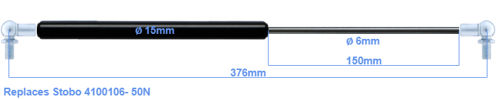The diameter of the cylinder of this gas spring is 15 millimeters. The cross section of the rod is 6 mm. The stroke of the gas spring is 150 millimeter. In total, the length is 376 millimeter. This is the distance between the centers of the mounting parts. Without the mounting parts this gas spring is 332 mm long (thread to thread). This gas spring (4100106-) has a force of 50 Newton. Attention: this is not an official Stobo gas spring, but a replacement gas spring. This replacement gas spring is a HAHN gas spring. The force (50 N) and dimensions are identical to the original.
