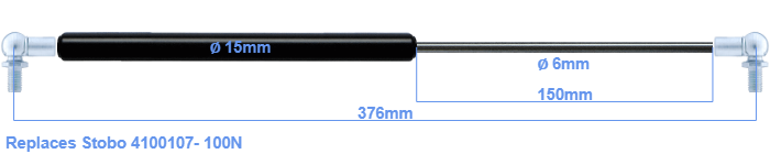 The diameter of the black cylinder of this gas spring is 15 millimeter. The cross section of the rod is 6 mm. The stroke of the gas spring is 150 millimeter. The total length of this replacement gas spring is 376 mm. This is the total distance between the centers of the two mounting parts. The distance from thread to thread (without mounting parts) is 332 mm. This replacement gas spring has a force of 100 Newton. This is not an original gas spring produced by Stobo, but it can replace a Stobo gas spring. This is a HAHN gas spring. Nevertheless, the dimensions and force are equal.