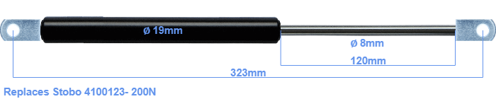 Replacement gas spring for the Stobo 4100123- 200 Newton. The eye has a thickness of 10mm and a hole diameter of 8.1mm. Brand: HAHN, a Stabilus company.