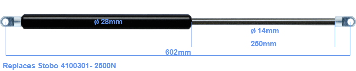The bore of the house of this replacement gas spring is 28 mm. The diameter of the rod is 14 millimeter. The stroke (the retracting part) has a length of 250 mm. The total length of this replacement is 602 millimeter. Note: this is the total length between the rotation points of the two mounting parts. Without the mounting parts this gas spring is 548 mm long (thread to thread). The force of this replacement gas spring is 2500 Newton. This gas spring can replace a Stobo gas spring, but is not an orignal Stobo one. This is a HAHN gas spring. Nevertheless, the dimensions and force are close to equal.