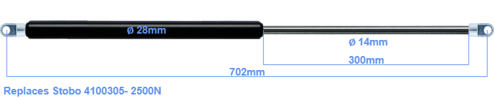 The diameter of the cylinder of this gas spring is 28 mm. The diameter of the rod totals 14 mm. The stroke of the gas spring is 300 millimeter. The total length of this replacement is 702 millimeter. Keep in mind that this is the length between the centers of the mounting parts. The distance from thread to thread (without mounting parts) is 648 mm. This replacement gas spring has a force of 2500 Newton. This is not an original gas spring produced by Stobo, but it can replace a Stobo gas spring. HAHN Gasfedern, a Stabilus subsidiary, is responsible for the production of this replacement gas spring. The gas spring has the brand HAHN. Nevertheless, this gas spring can be used as replacement gas spring, because the dimensions and forces are close to equal.