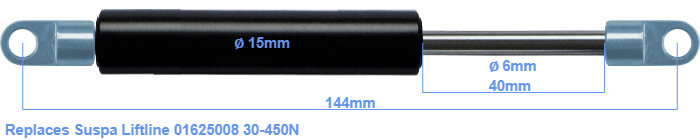 The diameter of the black cylinder of this gas spring is 15 millimeter. The cross section of the rod is 6 mm. The chrome part is called the rod. It has a length of 40 mm. The total length of this replacement is exactly 144 mm. This is the total distance between the centers of the two mounting parts. The length from thread to thread (exlcuding the mounting parts) is 112 millimeter. This replacement gas spring (01625008) has a force of 30-450 Newton (N). This gas spring can replace a Suspa Liftline gas spring, but is not an orignal Suspa Liftline one. This gas spring was produced by Stabilus subsidiary HAHN. The gas spring can be used without problems as a replacement, because the dimensions and force almost entirely equal.
